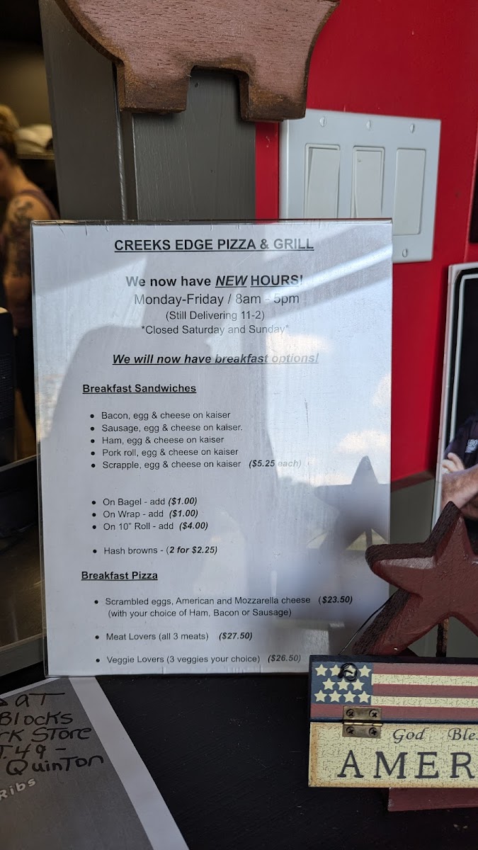 “ I stopped in for lunch at Creek's Edge Pizza & Grill in this sleepy town and ordered a turkey hoagie. It was well made, with fresh ingredients and just the right portion size—exactly what I was hoping for.There’s no inside seating, but they have picnic tables outside, which turned out to be a nice touch. The area is well-kept and peaceful, nestled right next to the water. It made for a relaxing lunch spot, perfect for unwinding. If you find yourself in this quiet town and are looking for a casual bite with a view, Creek's Edge is a good choice. ”